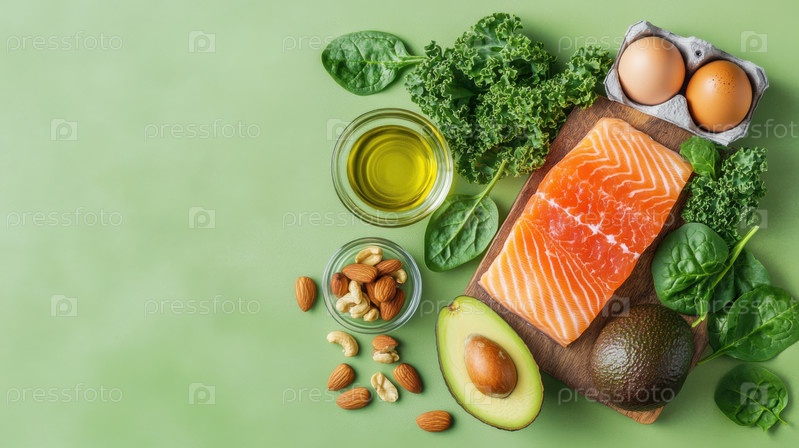 Плоская выкладка свежего филе лосося, половинок авокадо, ореховой смеси, оливкового масла, капусты, шпината и яиц на деревянной доске — идеальный вариант для сбалансированной кето-диеты