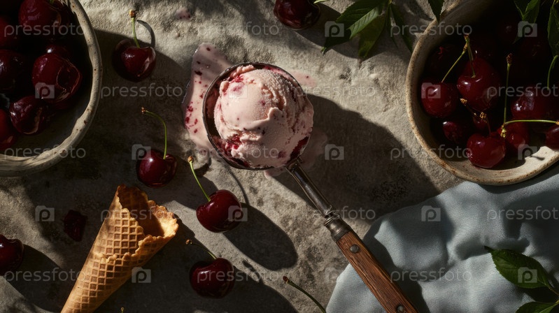 Шарик мороженого с вишней, ручной работы тает на деревенском каменном фоне со свежей вишней, вафельным рожком и фактурной тканью, запечатлевая момент сезонного десерта
