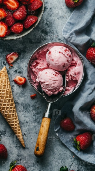 Шарики клубничного мороженого в металлической миске со свежей клубникой и вафельным рожком на деревенском каменном фоне. Летний десерт из натуральных ингредиентов