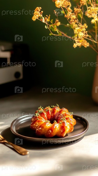 Изысканный десерт, покрытый карамелью, украшенный зеленью на черной керамической тарелке. Минималистский стиль еды с мягким светом и золотистыми сухоцветами