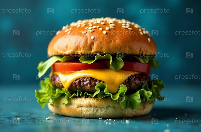 Сочная котлета бургера на синем фоне. Еда для меню ресторана. Генеративный ИИ