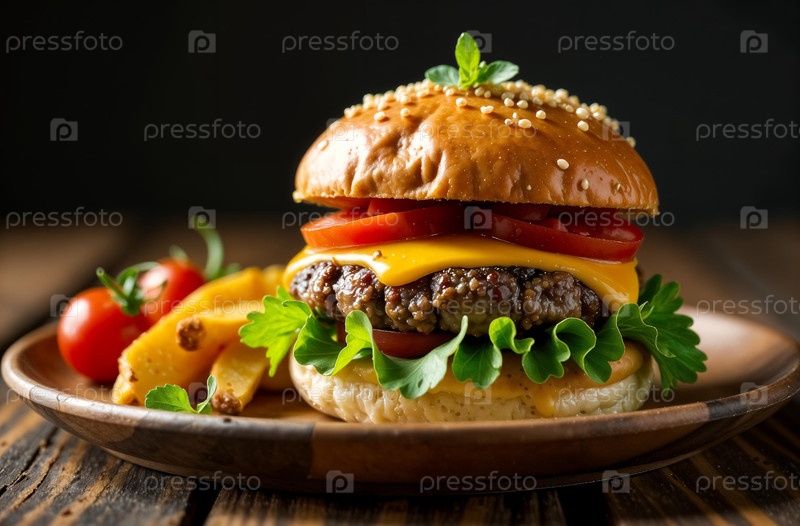 Сочная котлета бургера на темном фоне. Еда для меню ресторана. Генеративный ИИ