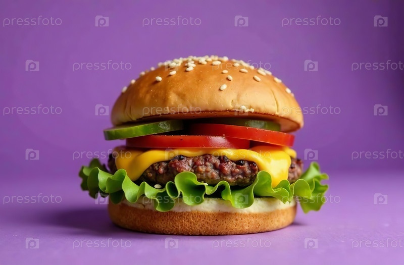 Сочная котлета бургера на фиолетовом фоне. Еда для меню ресторана. Генеративный ИИ