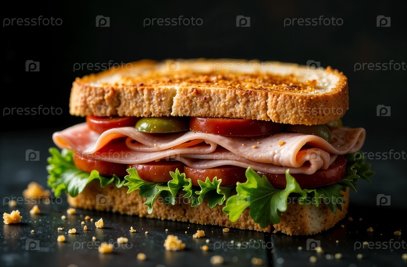 Сочный сэндвич с ветчиной на темном фоне. Еда для меню ресторана. Генеративный искусственный интеллект