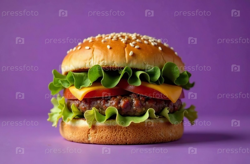 Сочная котлета бургера на фиолетовом фоне. Еда для меню ресторана. Генеративный ИИ