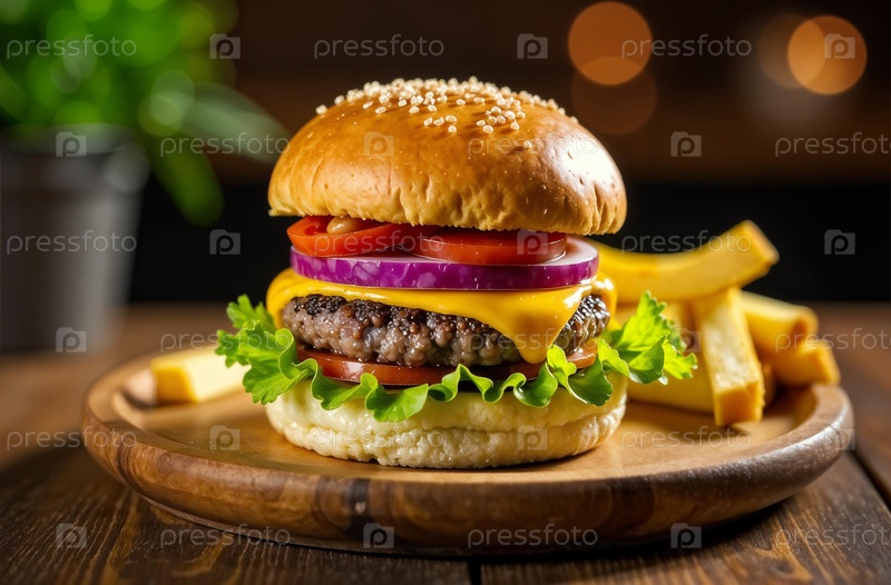 Сочная котлета бургера на темном фоне. Еда для меню ресторана. Генеративный ИИ