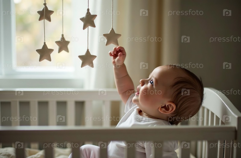 Мобиль над кроваткой, новорожденный трогает игрушки рукой, детская комната. Генеративный искусственный интеллект
