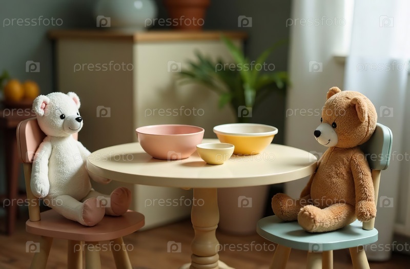 Игрушечный плюшевый мишка сидит за детским столом, игра для чаепития. Генеративный искусственный интеллект