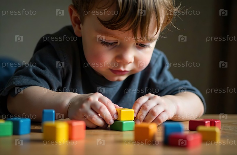 Ребенок играет с детскими игрушечными кубиками в игровой комнате. Генеративный искусственный интеллект