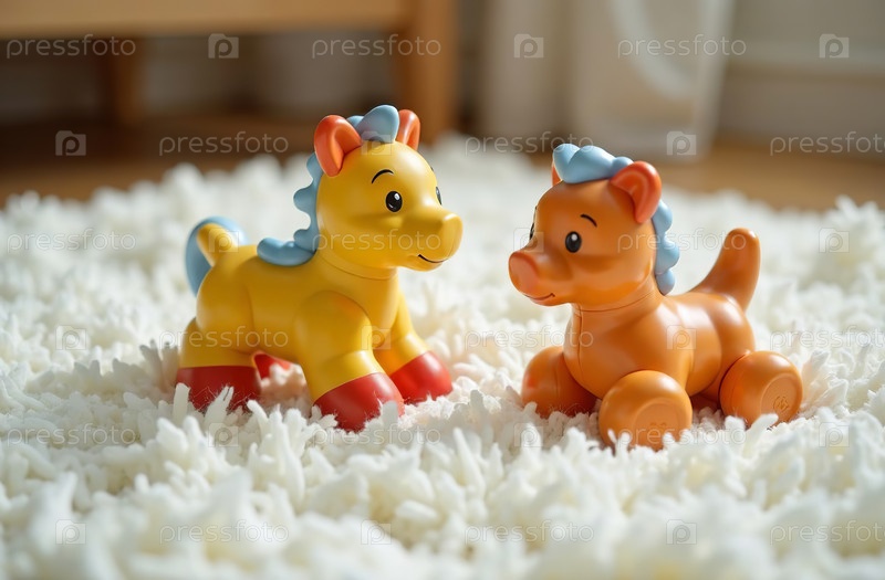 Детская игровая комната, красочные игрушки лежат на белом ковре в спальне. Генеративный искусственный интеллект
