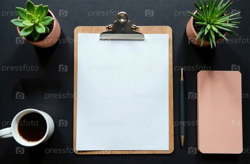 Flat Lay Office Desktop черный фон, минималистичные канцелярские принадлежности. генеративный искусственный интеллект