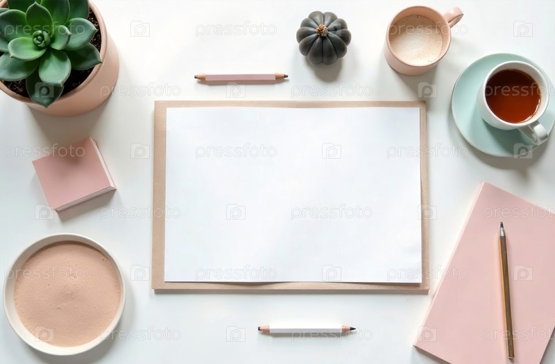 Flat Lay Office Desktop белый фон, минималистичные канцелярские принадлежности. генеративный искусственный интеллект