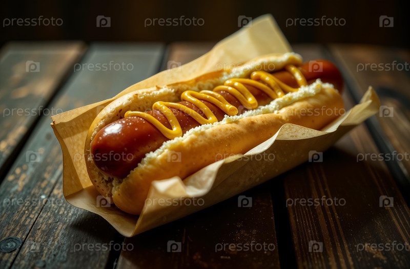 Сочная сосиска для хот-дога на темном фоне. Еда для меню ресторана. Генеративный искусственный интеллект