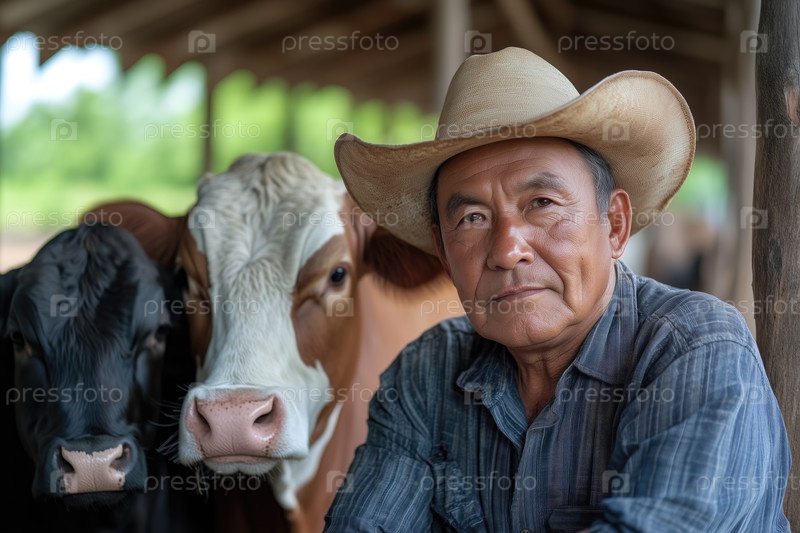 Портрет пожилого мужчины в ковбойской шляпе и коровы на ферме