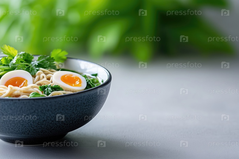 Лапша рамэн с яйцом и петрушкой в миске на сером фоне