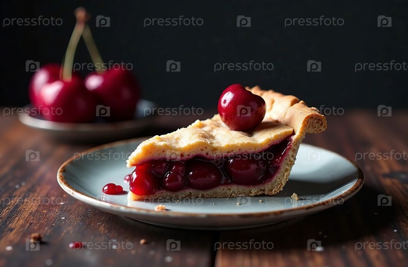 Кусочек фруктового вишневого торта, десертное фото для пекарни-ресторана. Генеративный искусственный интеллект
