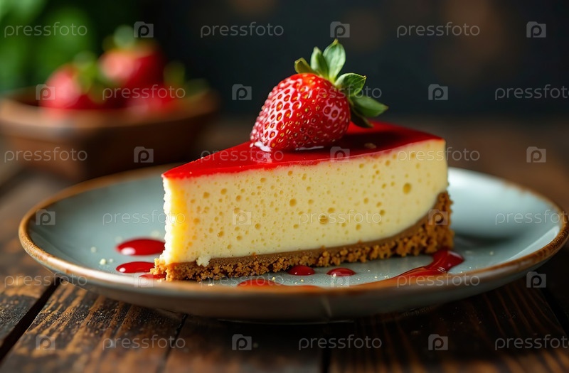 Кусочек классического чизкейка и клубники, десерт фото ресторана. Генеративный искусственный интеллект