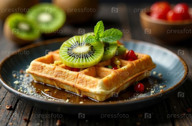 Квадратная бельгийская вафля с киви, фото еды для ресторана. Генеративный искусственный интеллект