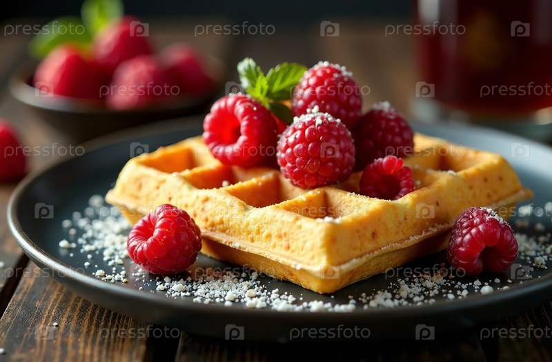 Квадратная бельгийская вафля с малиной, фото еды для ресторана. Генеративный искусственный интеллект