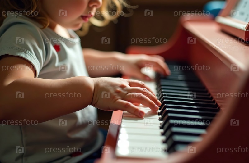 Ребенок играет на игрушечном пианино, молодой музыкант играет музыку в игровой комнате. Генеративный искусственный интеллект