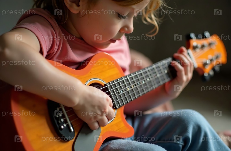 Ребенок играет на игрушечной гитаре, молодой музыкант играет музыку в игровой комнате. Генеративный искусственный интеллект