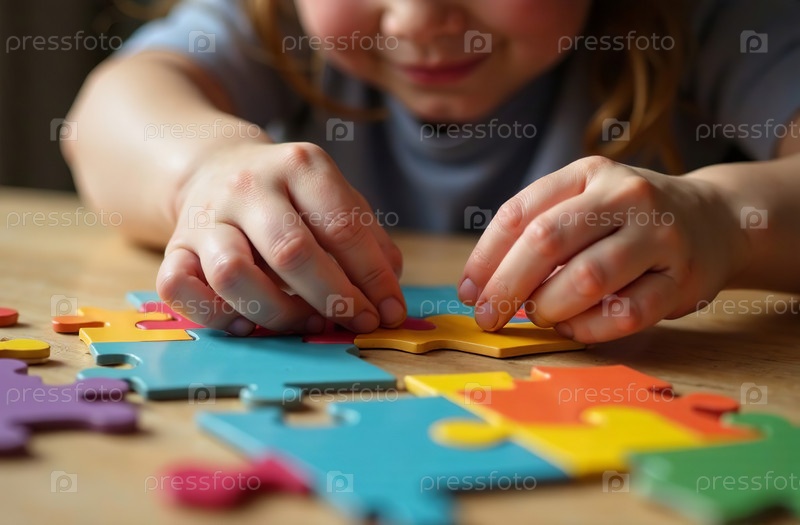 Ребенок собирает пазл в игровой комнате, игрушечная красочная мозаика. Генеративный искусственный интеллект
