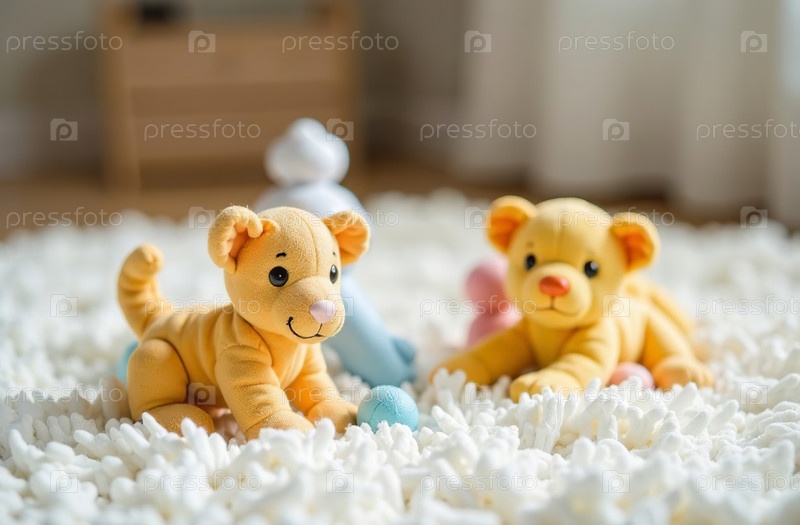 Детская игровая комната, разноцветные игрушки лежат на белом ковре в спальне. Генеративный искусственный интеллект