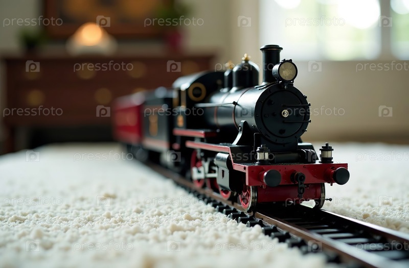Игрушечный поезд на белом ковре в игровой комнате, детская комната с железной дорогой. Генеративный искусственный интеллект