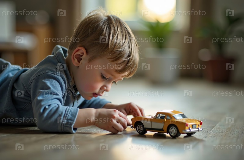 Ребенок играет с игрушечной моделью ретро автомобиля, дети раскрашивают игрушки. Генеративный искусственный интеллект
