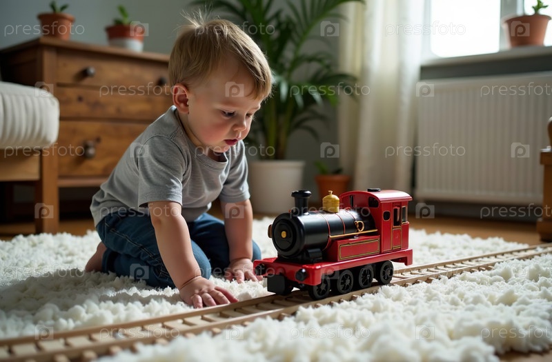 Игрушечный поезд на белом ковре в игровой комнате, ребенок играет с железной дорогой. Генеративный искусственный интеллект