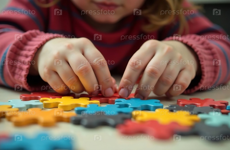 Ребенок собирает пазл в игровой комнате, игрушечная красочная мозаика. Генеративный искусственный интеллект