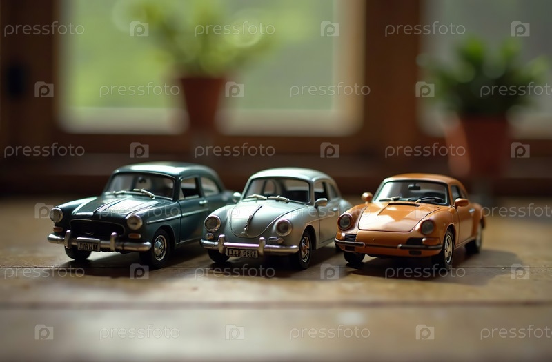 Игрушечные цветные модели ретро машин стоят на деревянном столе в игровой комнате. Генеративный искусственный интеллект