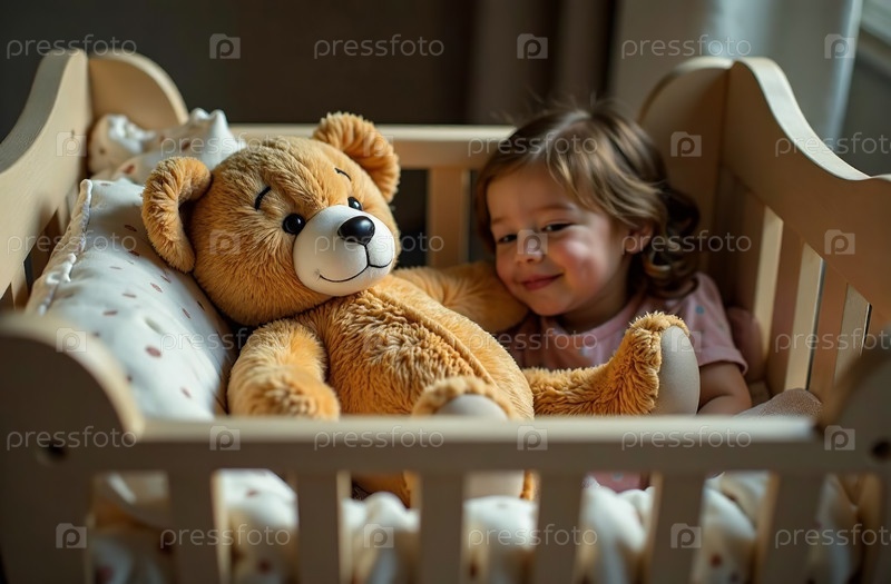 Плюшевый мишка и девочка лежит в кроватке, мягкая игрушка в детской спальне. Генеративный ИИ