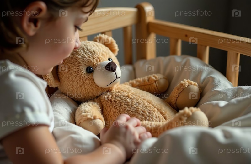 Плюшевый мишка лежит в кроватке, мягкая игрушка в детской спальне. Генеративный ИИ