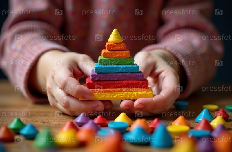 Ребенок собирает игрушечную пирамидку в игровой комнате, игрушечная красочная мозаика. Генеративный искусственный интеллект