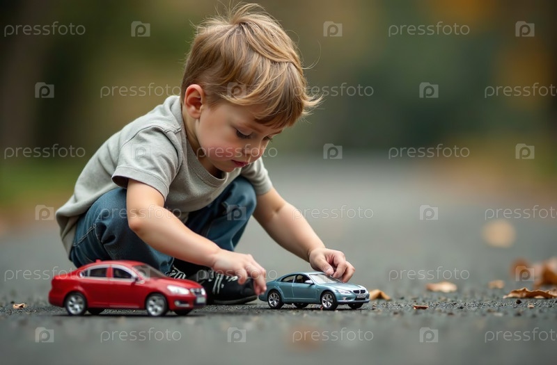 Ребенок играет с игрушечной моделью автомобиля, дети раскрашивают игрушки. Генеративный искусственный интеллект