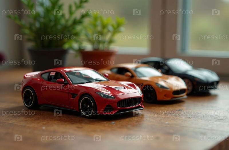 Игрушечные цветные модели машин стоят на деревянном столе в игровой комнате. Генеративный искусственный интеллект