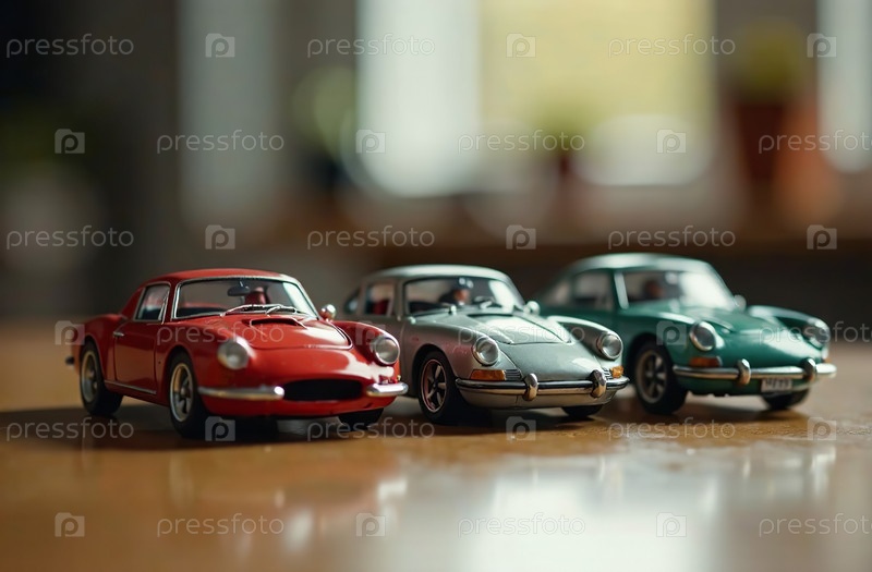 Игрушечные цветные модели машин стоят на деревянном столе в игровой комнате. Генеративный искусственный интеллект