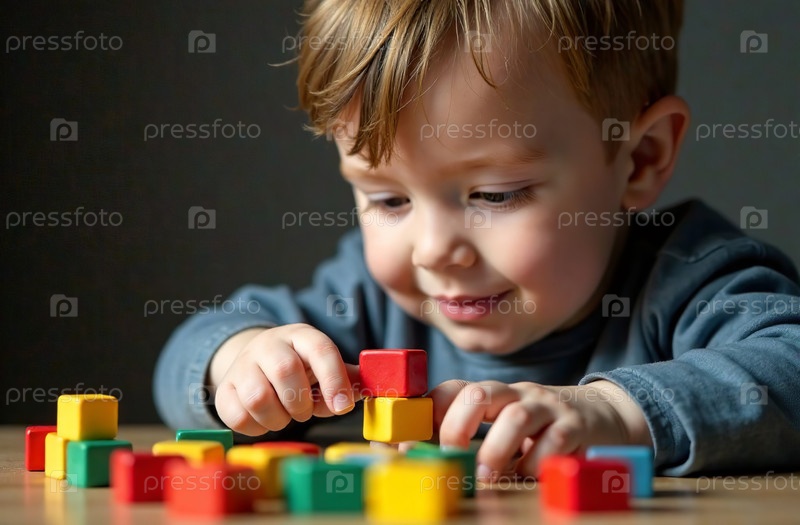 Ребенок играет с детскими игрушечными кубиками в игровой комнате. Генеративный искусственный интеллект