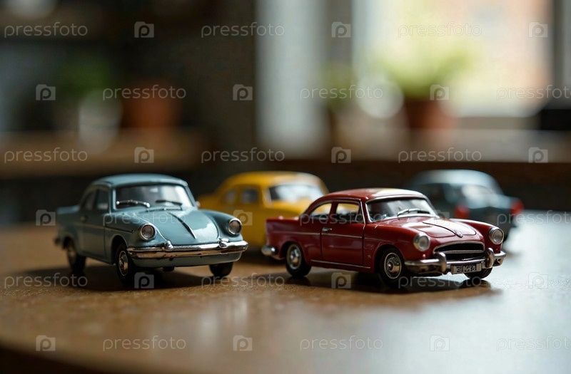 Игрушечные цветные модели машин стоят на деревянном столе в игровой комнате. Генеративный искусственный интеллект