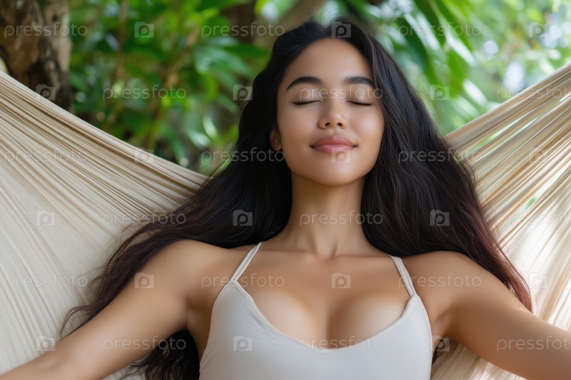 Красивая молодая женщина в белом бикини загорает на шезлонге в саду
