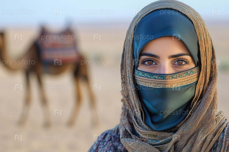 Женщина с Ближнего Востока в хиджабе и с верблюдом на заднем фоне в пустыне