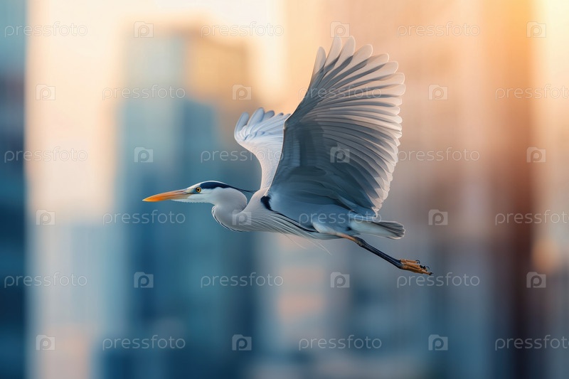 Дикая цапля летит над городом