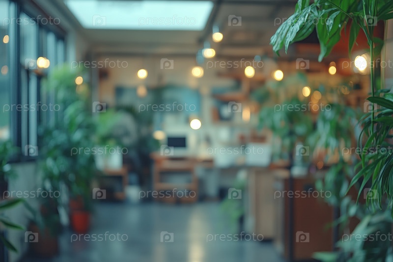 Размытый фон, интерьер офиса с растениями