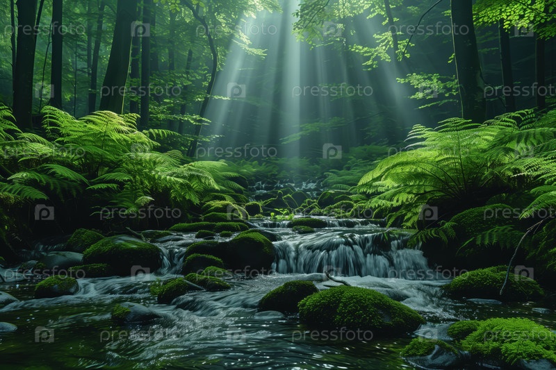 Красивый зеленый лес с небольшим ручьем в утреннем свете