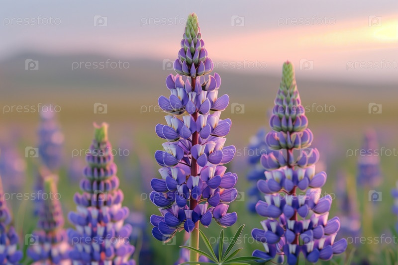 Цветы люпина цветут в поле на закате. Красивый фон природы