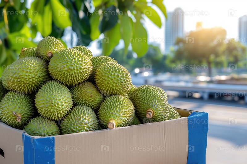 Свежие плоды дуриана в коробке на размытом фоне улицы