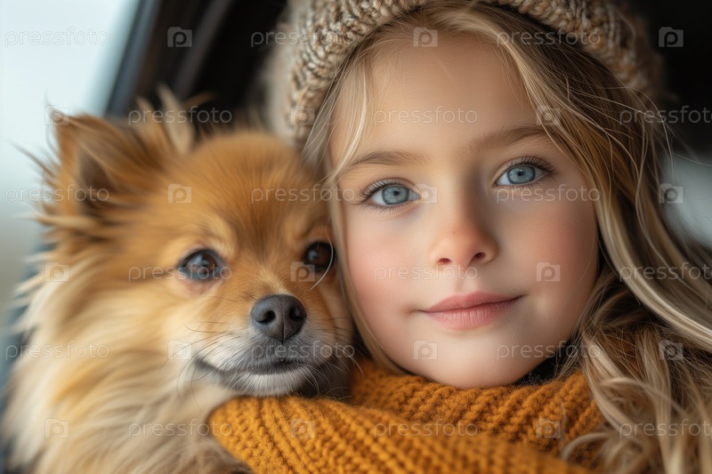Маленькая девочка со шпицем путешествует на заднем сиденье автомобиля зимой