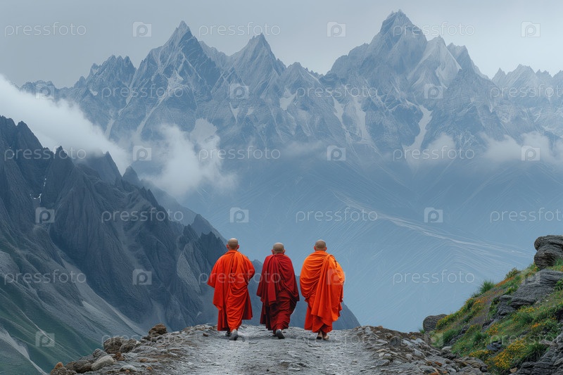 Три буддийских монаха идут по горной дороге