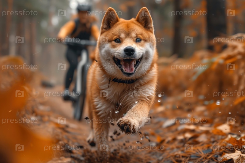 Собака породы сиба-ину бежит с велосипедистом на прогулке